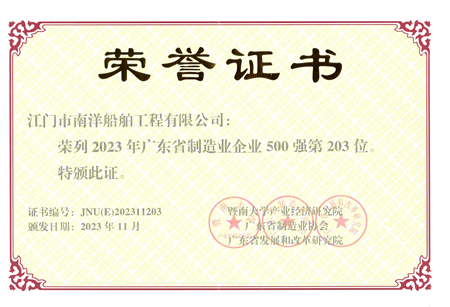 ![]() 2023年12月 榮獲“廣東省制造業(yè)企業(yè)500強(qiáng)"第203位。 |