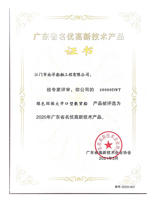 近日,廣東省高新技術(shù)企業(yè)協(xié)會(huì )發(fā)文《關(guān)于公布2020年廣東省名優(yōu)高新技術(shù)產(chǎn)品名單的通知》(粵高企協(xié)[2021]3號),我司“40000DWT綠色環(huán)保大開(kāi)口型散貨船”被認定為廣東省名優(yōu)高新技術(shù)產(chǎn)品。