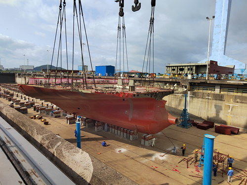 2023年5月5日,南洋重工廠(chǎng)區建造的首艘40500DWT 散貨船(JNS616)順利進(jìn)塢搭載,較原計劃提前了46天。